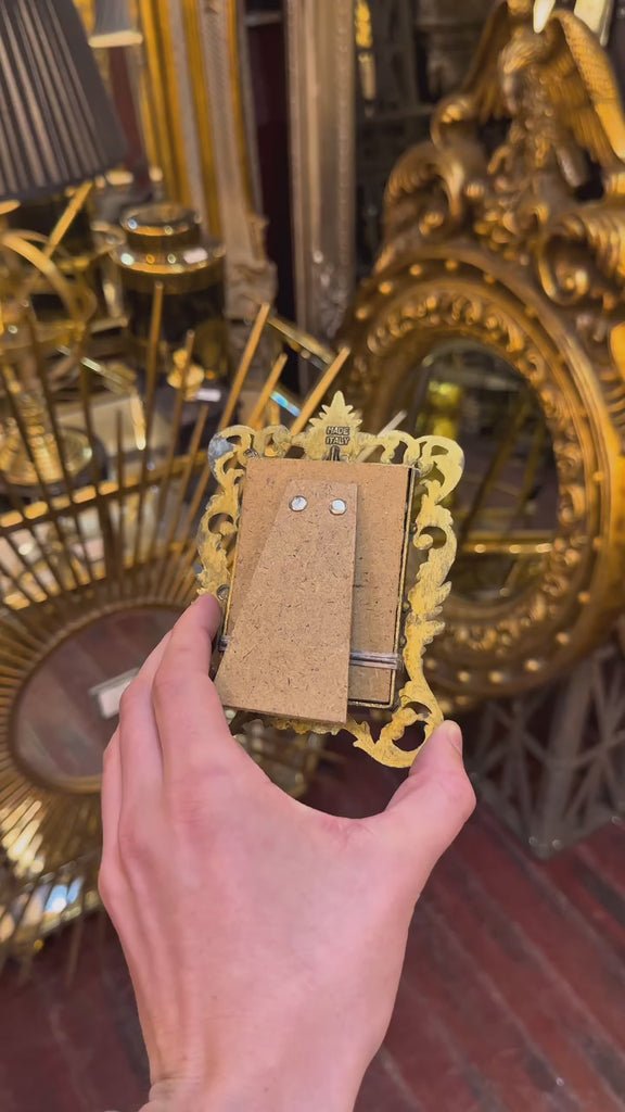 A beautifully detailed tiny gold mirror with its own stand, handmade in Italy. Richly ornate and full of character, it's stamped "Made Italy" on the back — a perfect finishing touch for any space. Only three available.